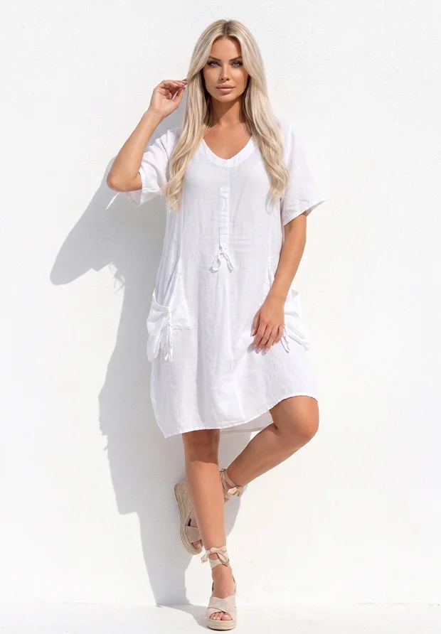 - Ozdobne Troczki: Przy kieszeniach znajdują się stylowe sznureczki (troczki), które umożliwiają regulację marszczenia materiału, nadając sukience unikalny kształt i modny wygląd w stylu lagena.