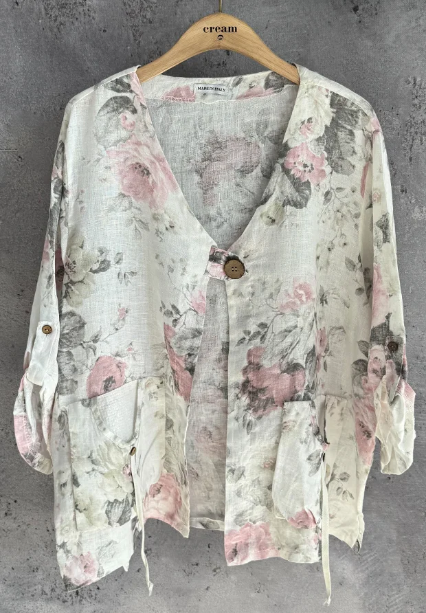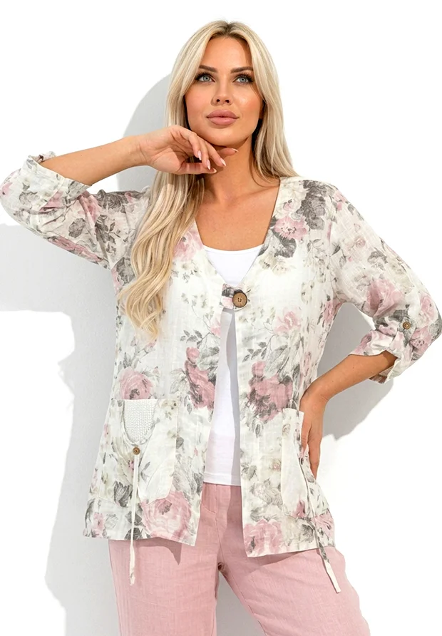 MADE IN ITALY WŁOSKA BIAŁA LNIANA BLUZKA NARZUTKA W KWIATOWE WZORY