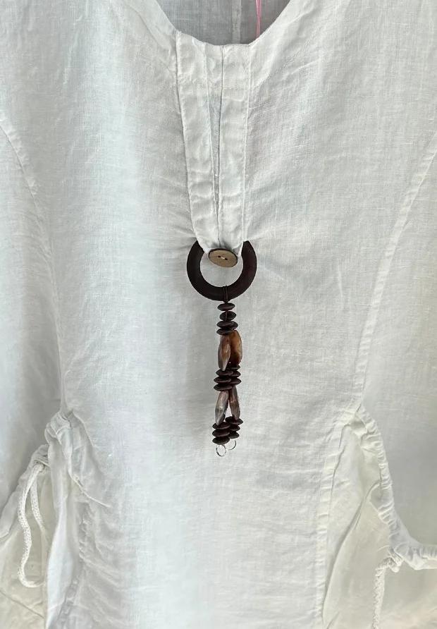 - Stylowy dodatek: dekolt w serek został ozdobiony efektownym naszyjnikiem z naturalnymi elementami, który dodaje całości etnicznego charakteru.