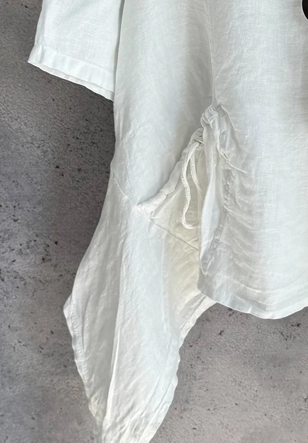 - Detale wykończenia: praktyczne, luźne kieszenie z przodu oraz surowe przeszycia podkreślają naturalny i swobodny wygląd tuniki.