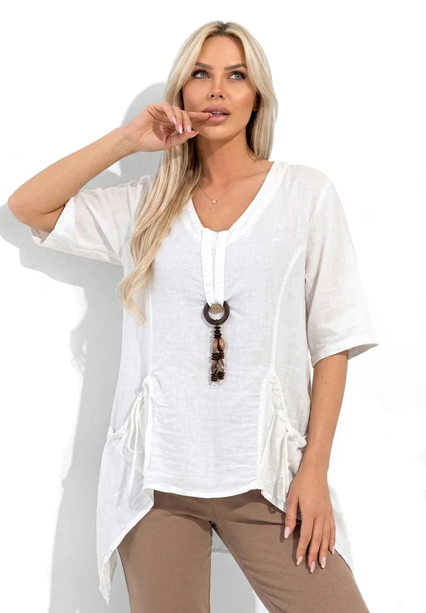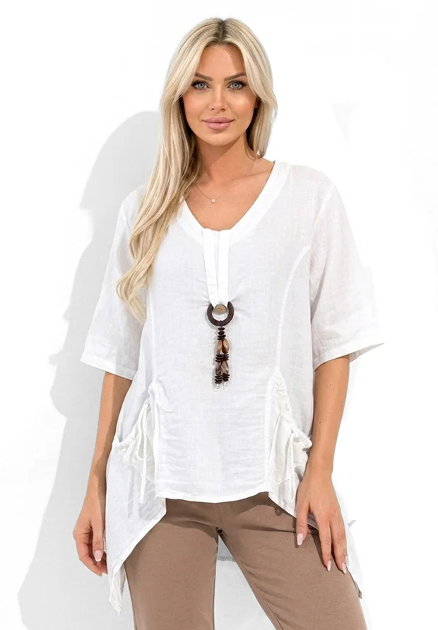 MADE IN ITALY WŁOSKA BIAŁA LNIANA BLUZKA Z NASZYJNIKIEM / ENZO MICCICO