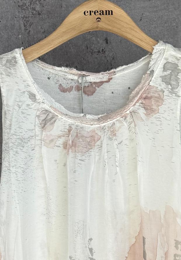 - Kobiecy wzór: delikatne przejście kolorów od bieli do pudrowego różu oraz warstwowy, asymetryczny dół optycznie wysmuklają sylwetkę i nadają jej nowoczesny wygląd.