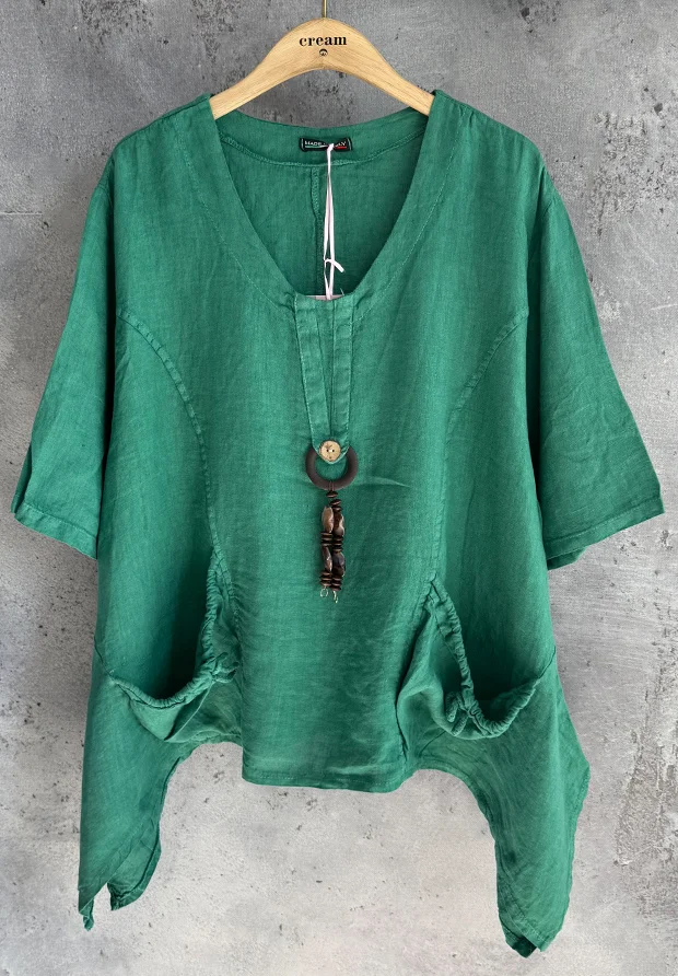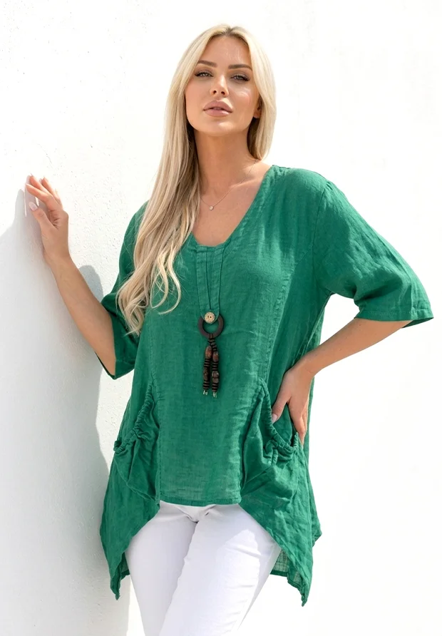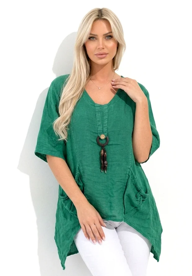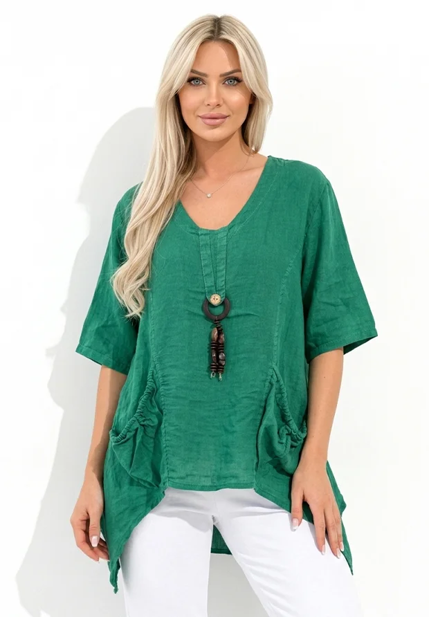 MADE IN ITALY WŁOSKA ZIELONA LNIANA BLUZKA Z NASZYJNIKIEM / ENZO MICCICO