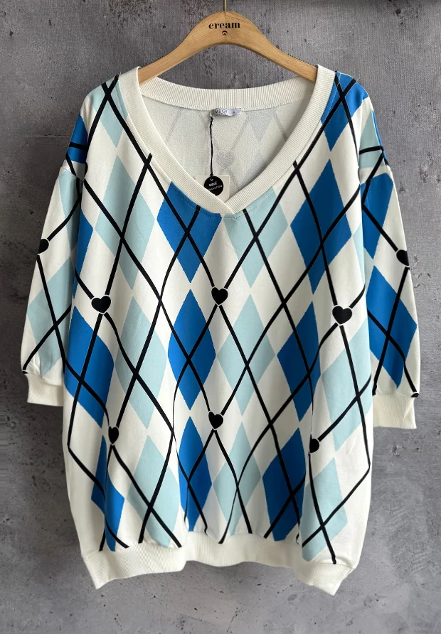 MEGI BIAŁA BLUZA TUNIKA W ROMBY I SERDUSZKA / CHABROWY & JASNO NIEBIESKI / UNI / B2939
