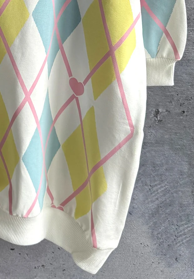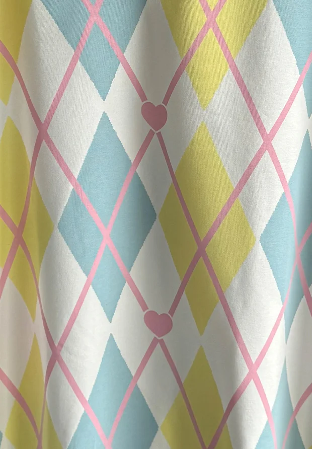 Na całości wzory w romby oraz serduszka.