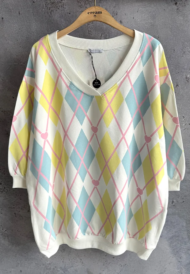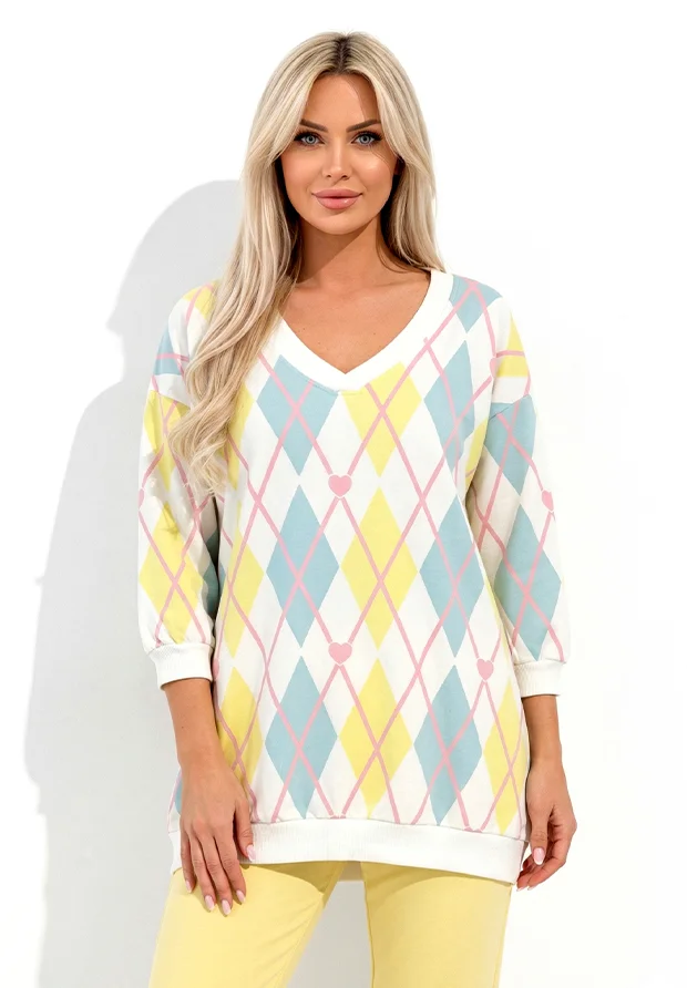 MEGI BIAŁA BLUZA TUNIKA W ROMBY I SERDUSZKA / CYTRYNOWY & JASNO NIEBIESKI / UNI / B2939