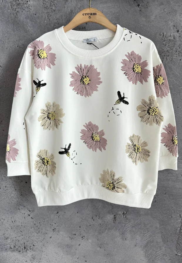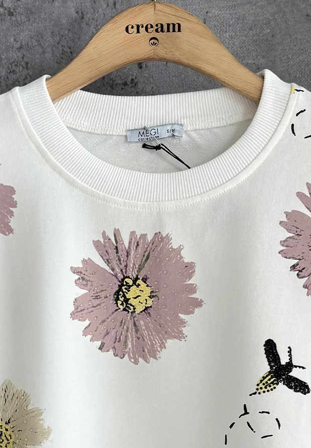MEGI BIAŁA BLUZA Z KWIATOWYM NADRUKIEM / PUDROWO WRZOSOWY RÓŻ & JASNY RÓŻ/ B2758