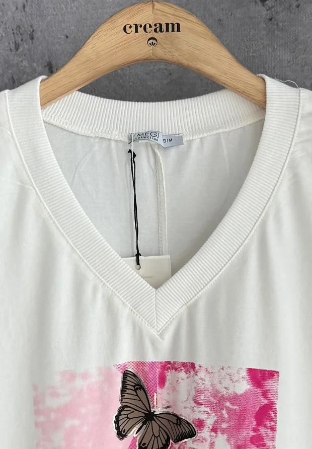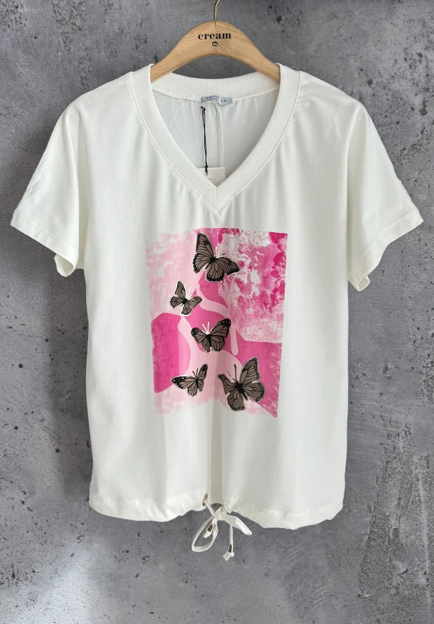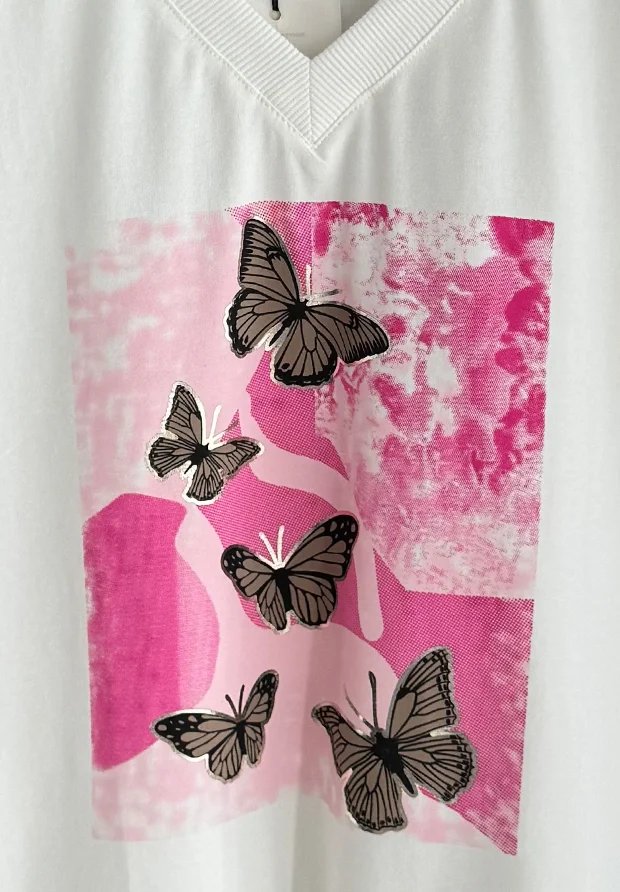 MEGI BIAŁA BLUZKA T-SHIRT NADRUK Z MOTYLKAMI / CUKIERKOWY RÓŻ & FUKSJA / B2885