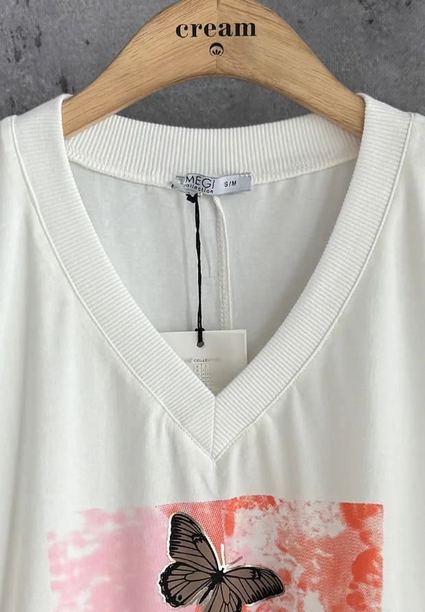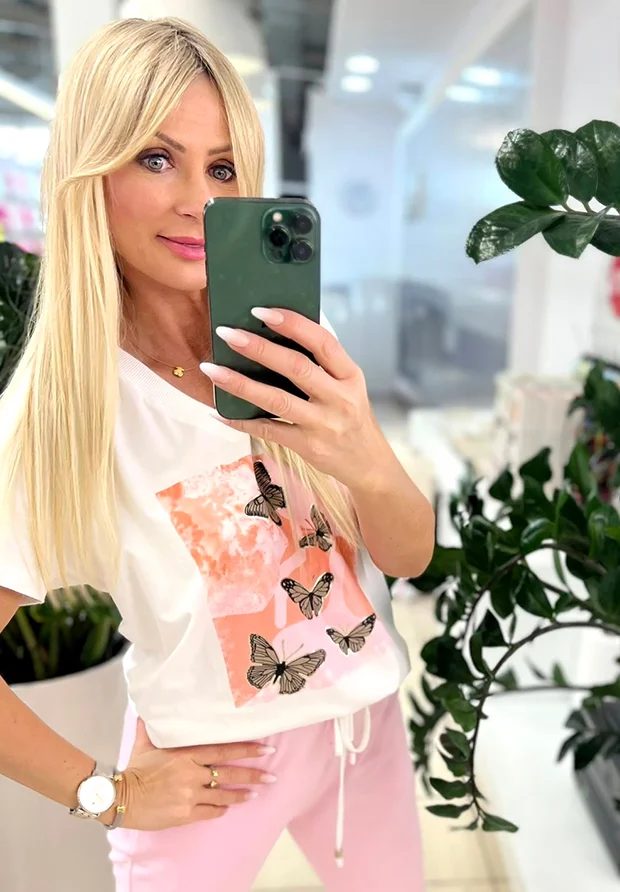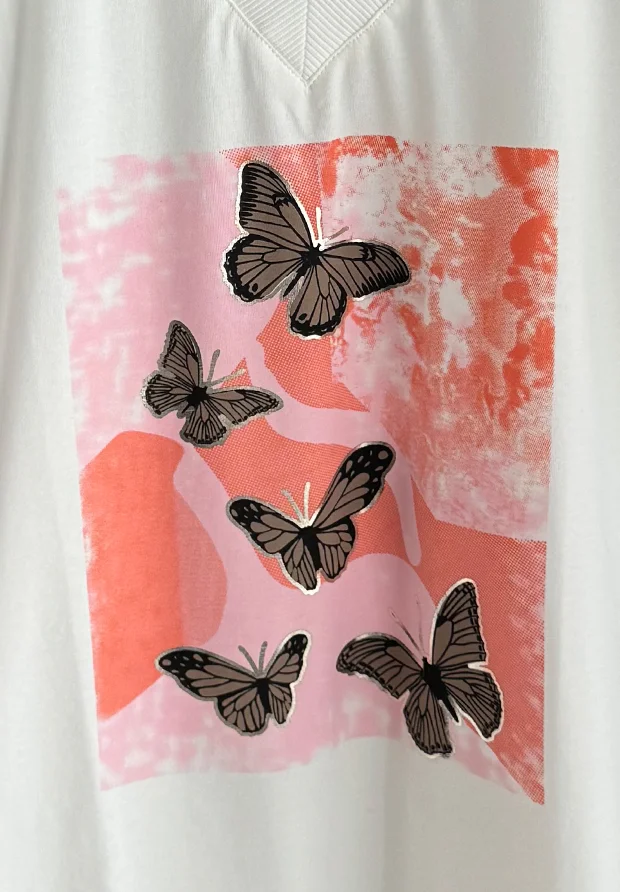 MEGI BIAŁA BLUZKA T-SHIRT NADRUK Z MOTYLKAMI / CUKIERKOWY RÓŻ & MANDARYNKA / B2885