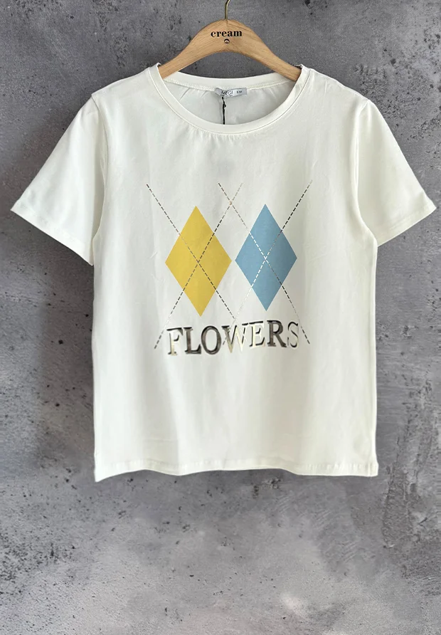 Na przodzie nadruk wzór w romby oraz nadrukowany napis : Flowers