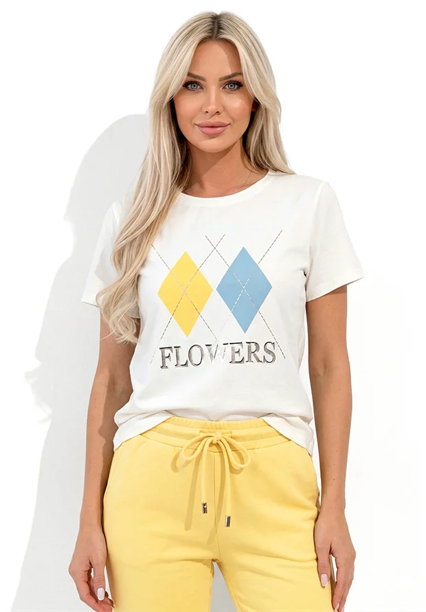 MEGI BIAŁA BLUZKA T-SHIRT W ROMBY / BANANOWY & JASNO NIEBIESKI / B2948