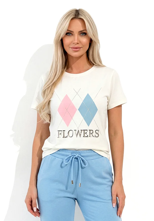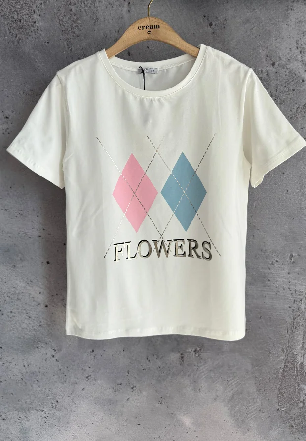 Na przodzie nadruk wzór w romby oraz nadrukowany napis : Flowers