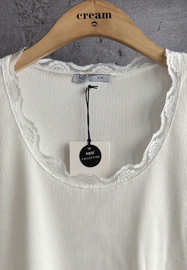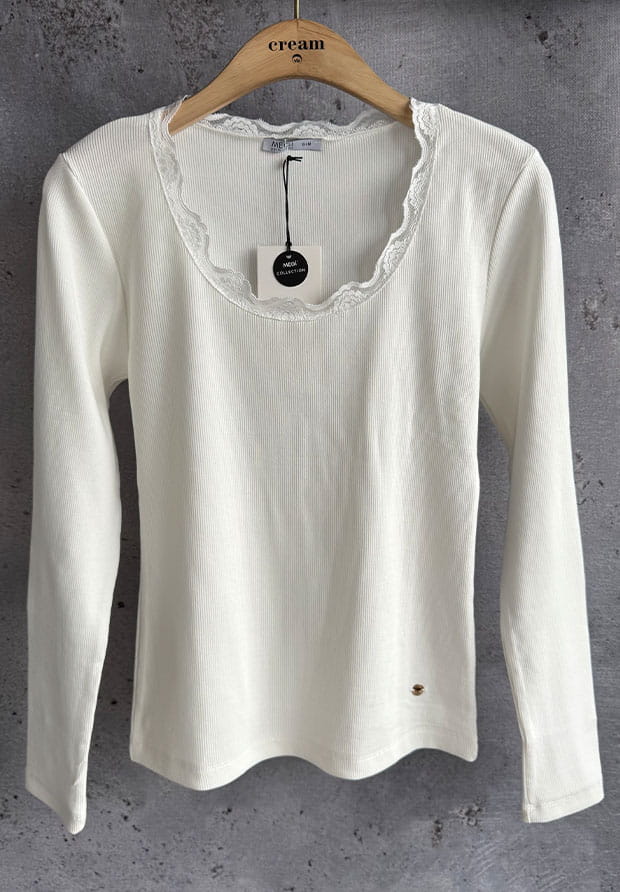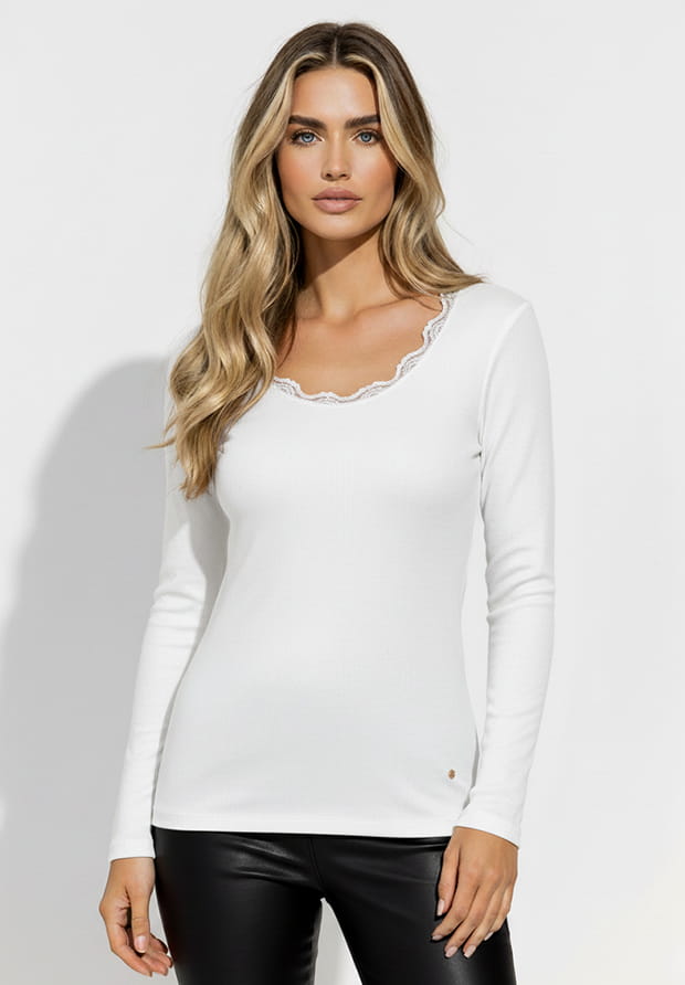 MEGI BIAŁA PRĄŻKOWANA BLUZKA Z KORONKOWYM DEKOLTEM / B2453