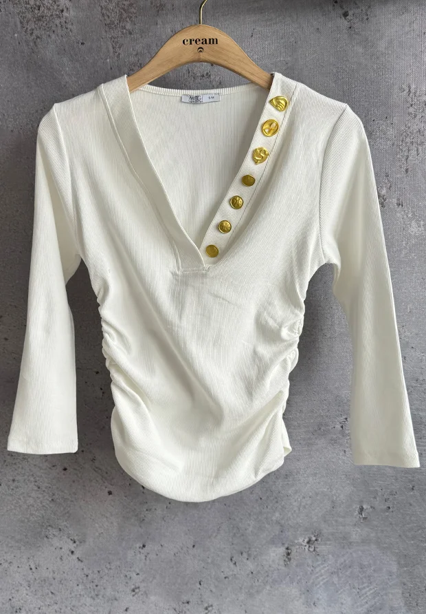 MEGI BIAŁA PRĄŻKOWANA BLUZKA ZE ZŁOTYMI OZDOBNYMI GUZIKAMI / B2730