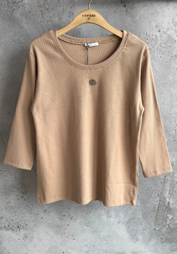 MEGI CAPPUCCINO PRĄŻKOWANA BLUZKA Z METALOWYM ZNACZKIEM / B1320