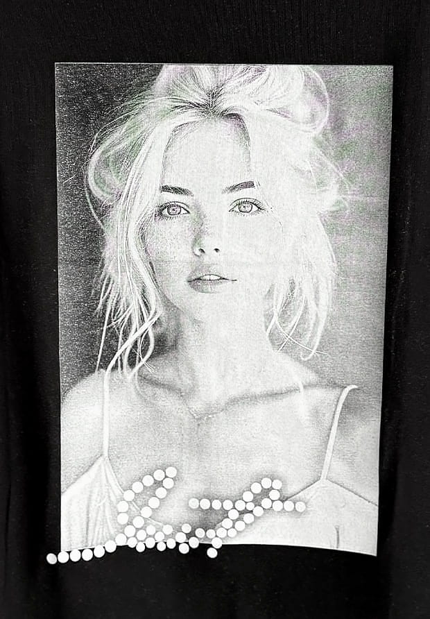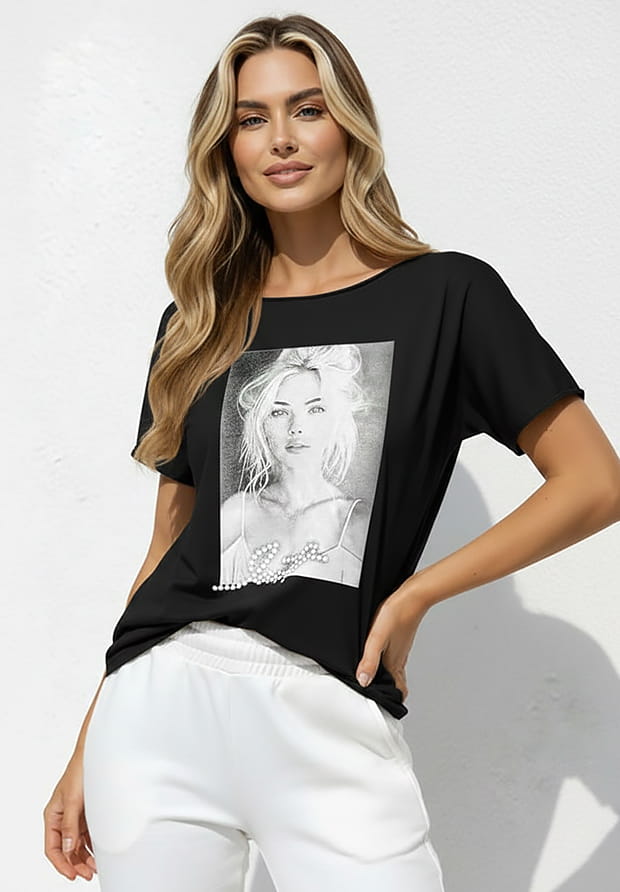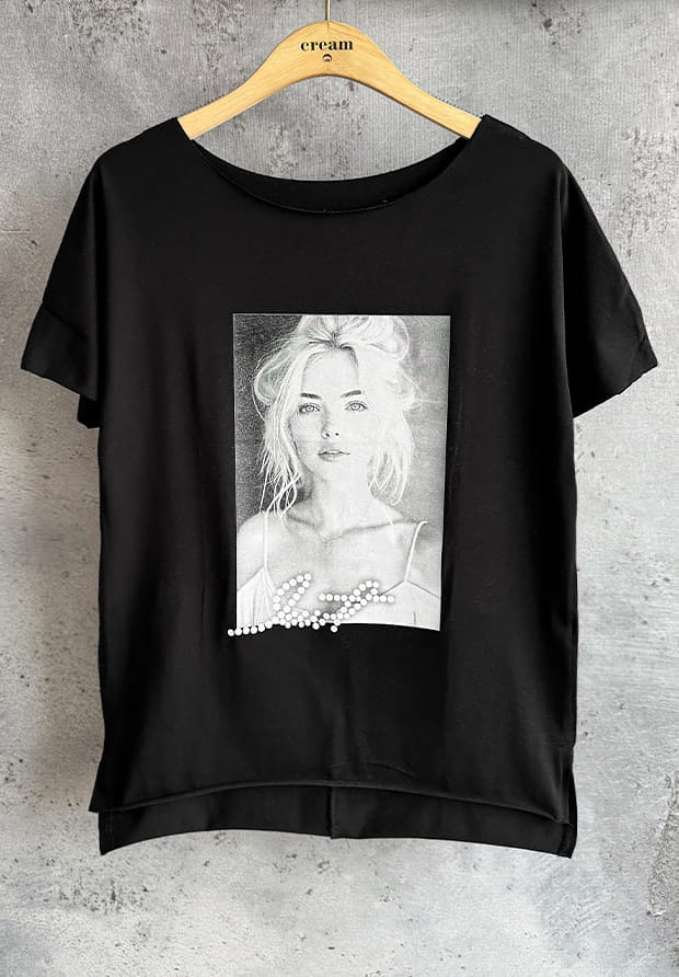 MEGI CZARNA LASEROWO CIĘTA BLUZKA / NADRUK Z TWARZĄ KOBIETY / B1707