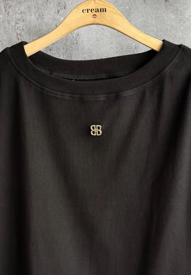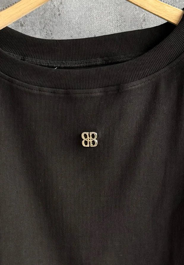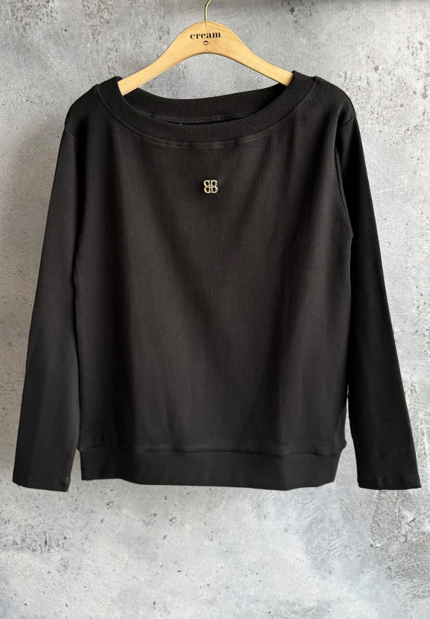 MEGI CZARNA PRĄŻKOWANA BLUZKA Z METALOWYM ZNACZKIEM / B2498