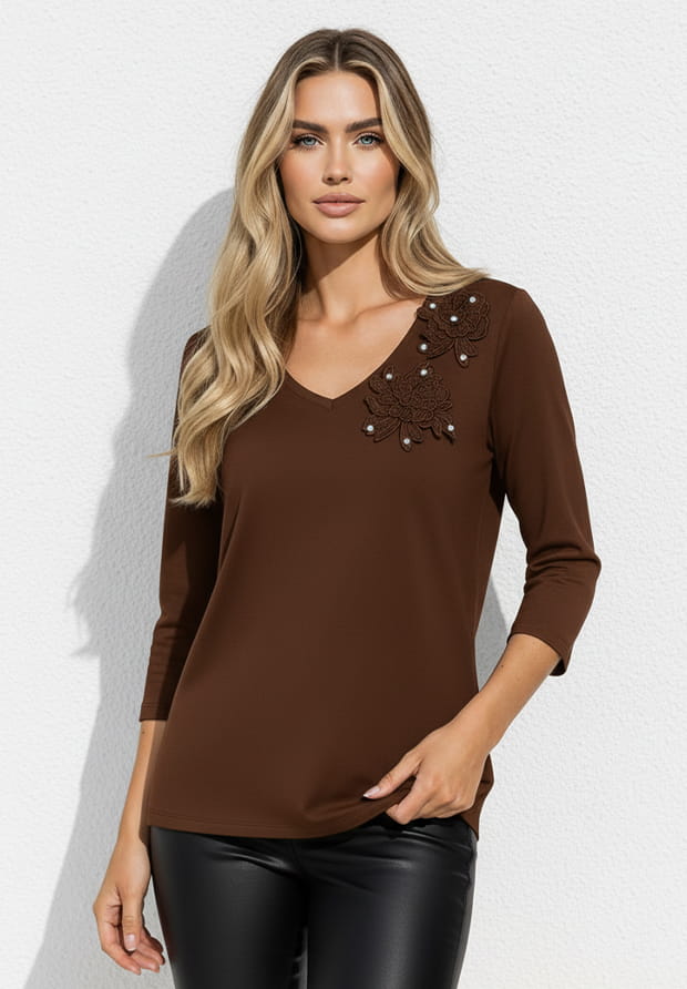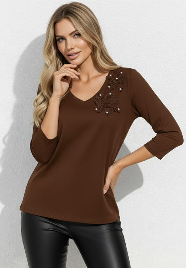 MEGI CZEKOLADOWO BRĄZOWA BLUZKA Z NASZYTYMI KWIATAMI ZDOBIONYMI CYRKONIAMI / B2250