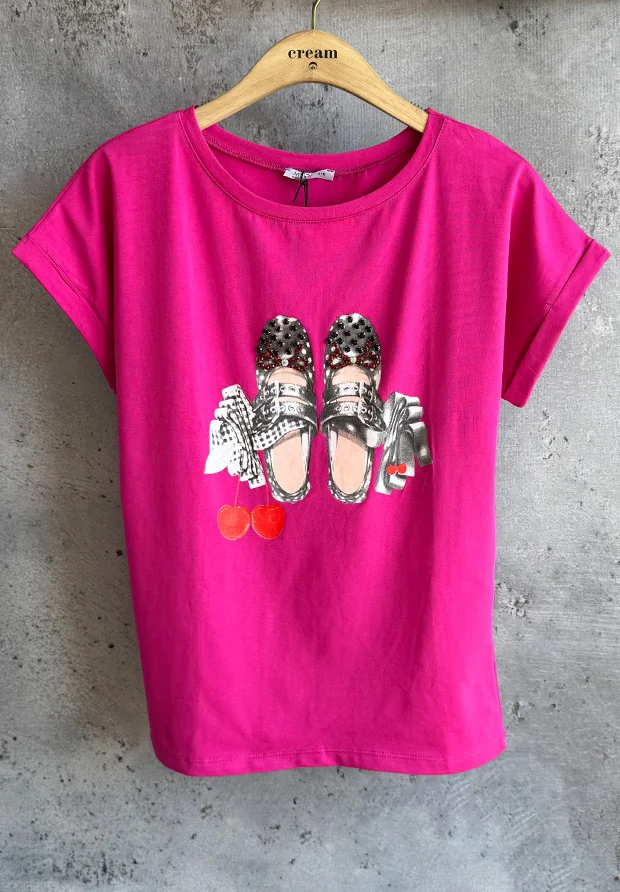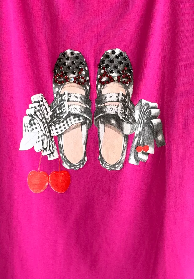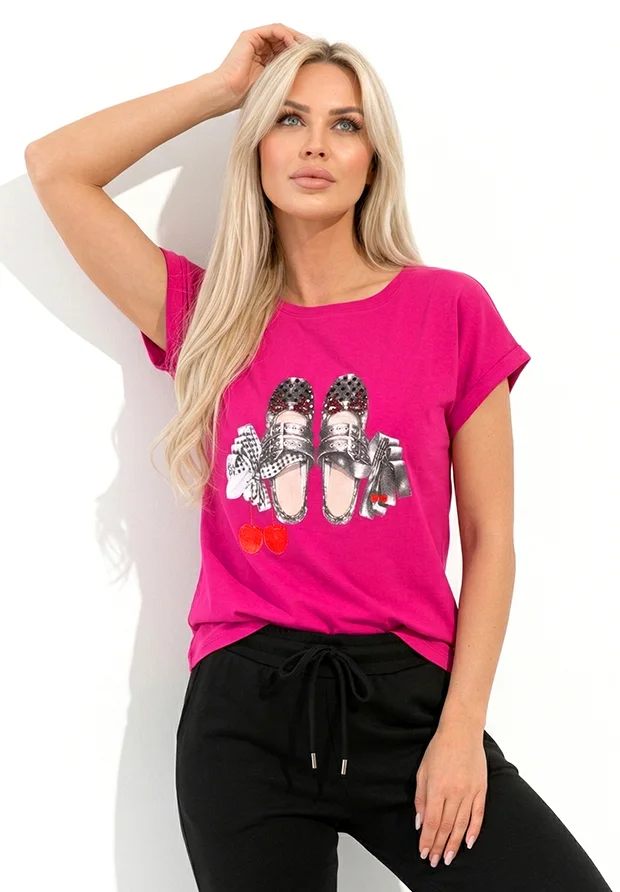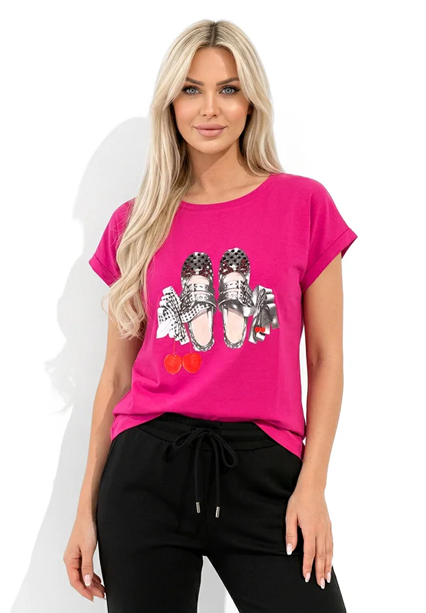 MEGI FUKSJOWA BLUZKA Z NADRUKIEM BALERINEK I WISIENEK / CYRKONIE / B1700