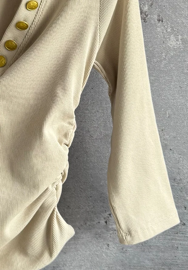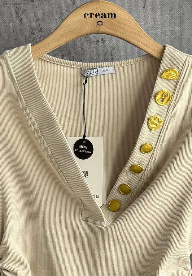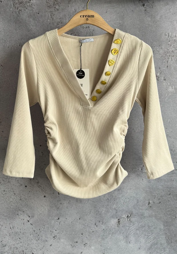 MEGI JASNO BEŻOWA PRĄŻKOWANA BLUZKA ZE ZŁOTYMI OZDOBNYMI GUZIKAMI / B2730