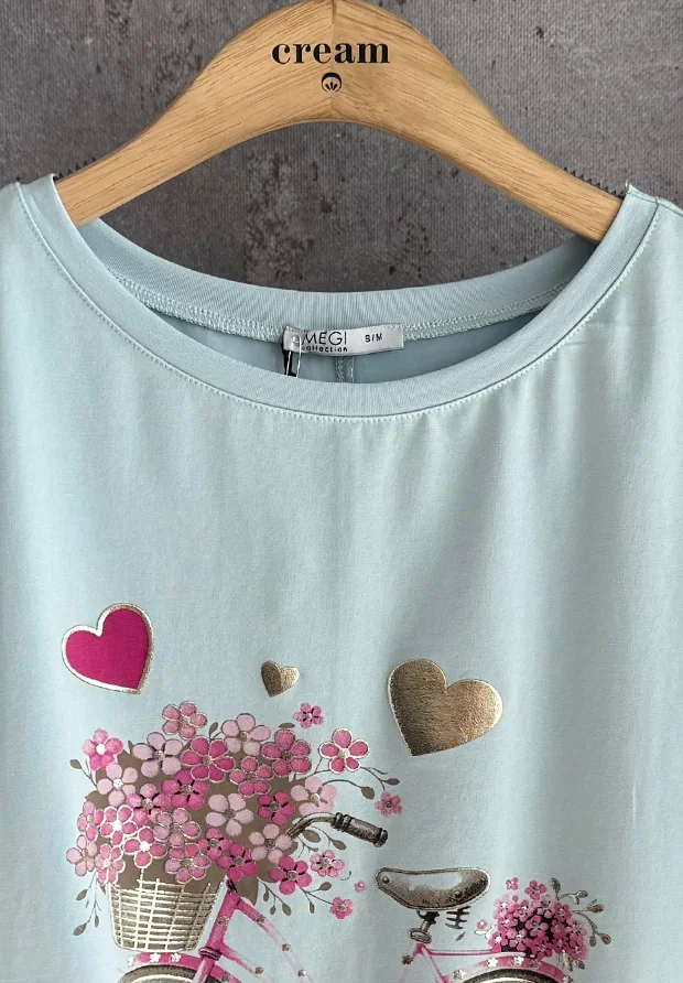 Na przodzie nadruk - rower z koszem z kwiatkami i serduszkami.