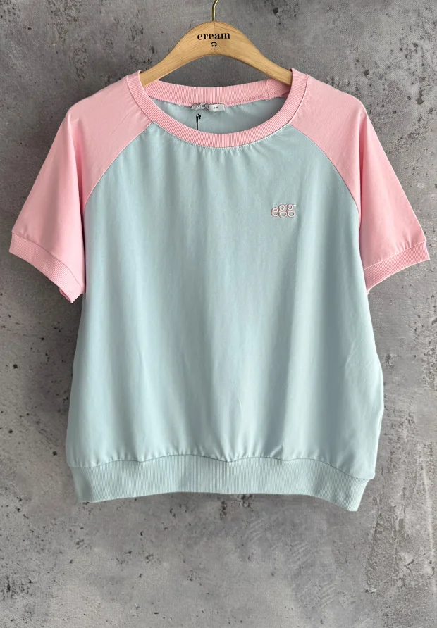 MEGI JASNO NIEBIESKA BLUZKA T-SHIRT Z HAFTOWANYM NAPISEM / CUKIERKOWO RÓŻOWE DODATKI / B2847