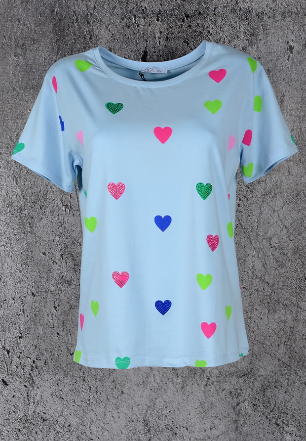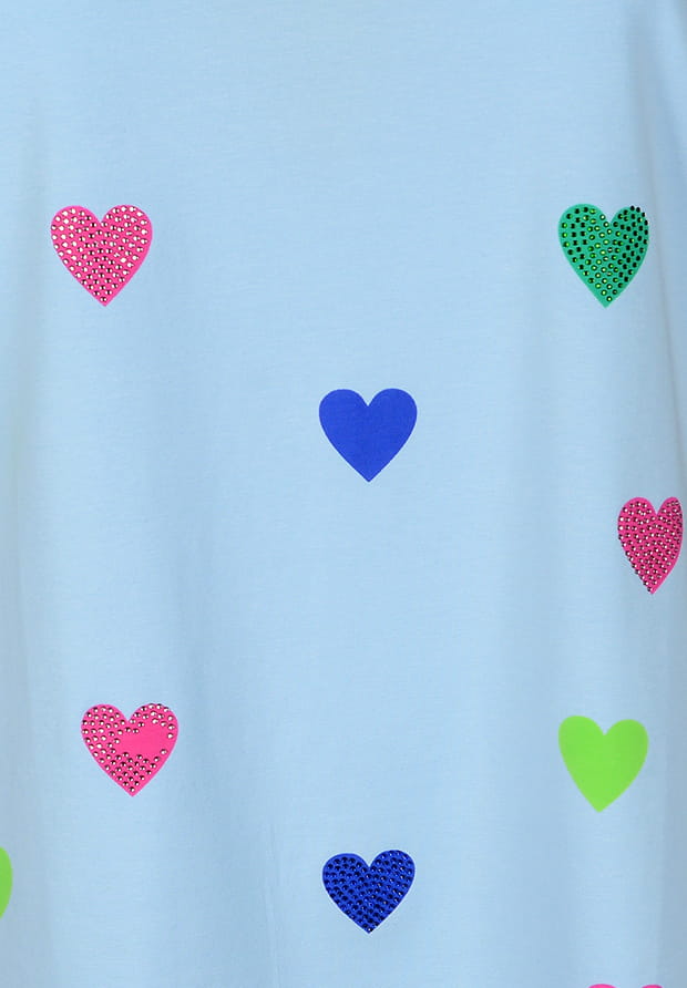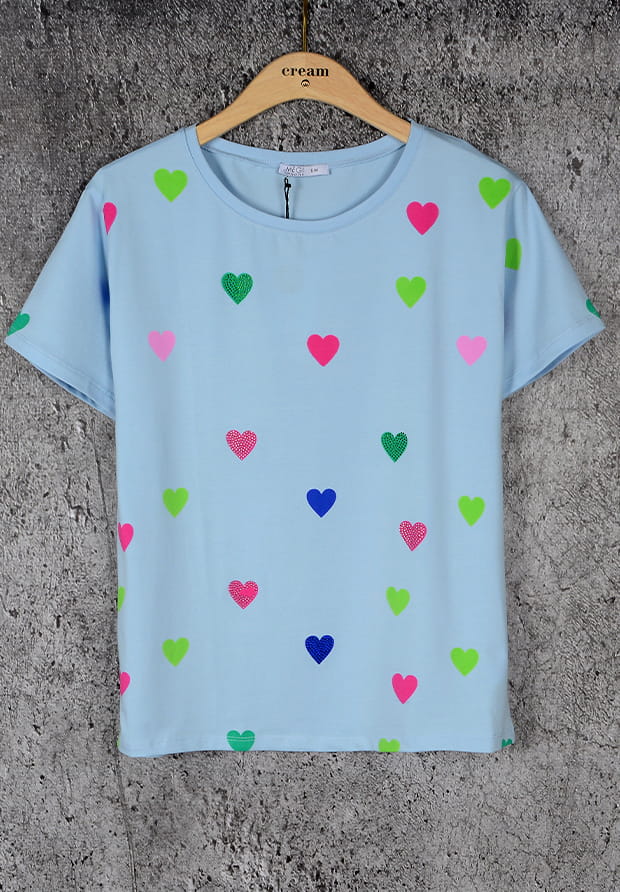 MEGI JASNO NIEBIESKA BLUZKA W KOLOROWE SERDUSZKA / KRYSZTAŁKI / B1685
