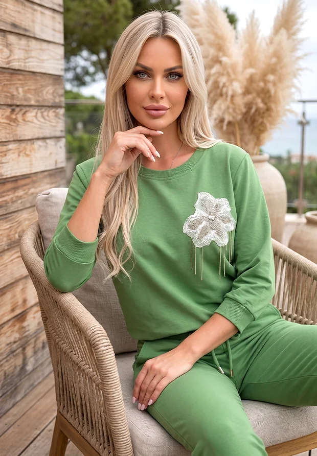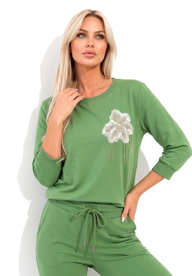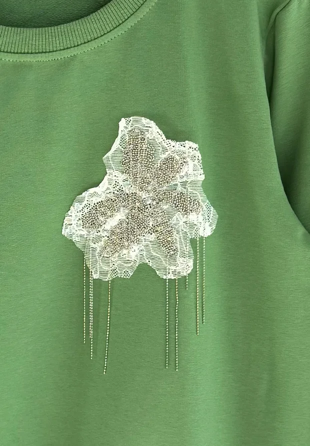 MEGI ZIELONA BLUZA / KORONKOWY KWIAT WYKOŃCZONY ŁAŃCUSZKAMI / B1401