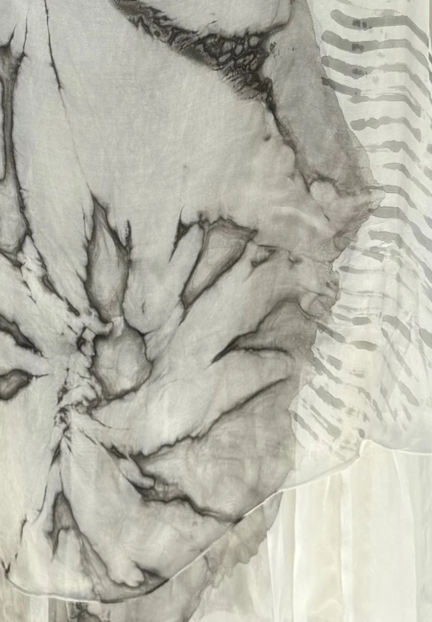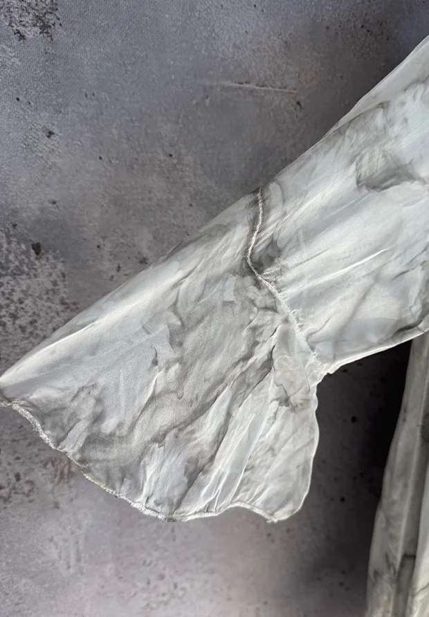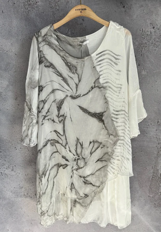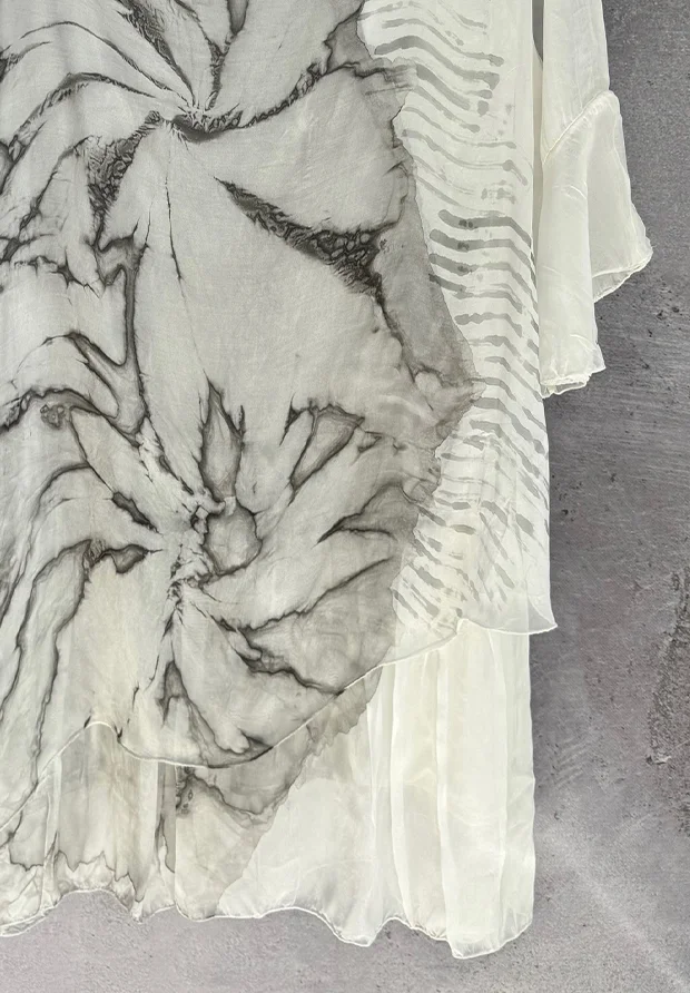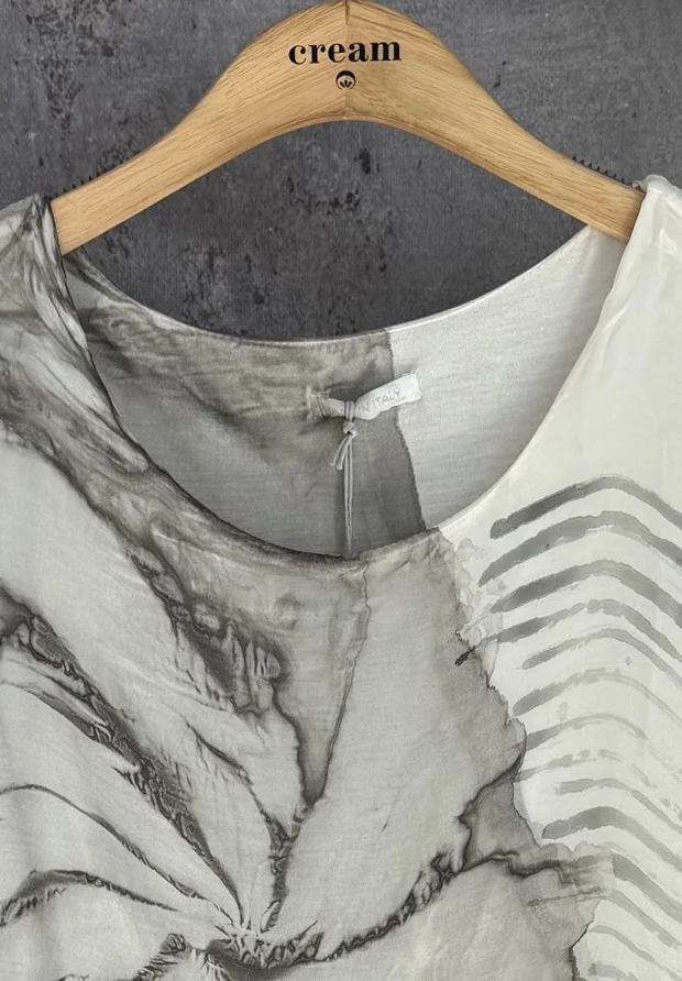 WŁOSKA JEDWABNA SUKIENKA 3D – ARTSTYCZNY MARMURKOWY WZÓR – SZARA – MADE IN ITALY