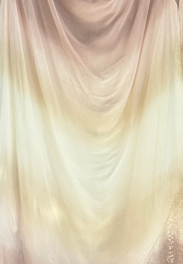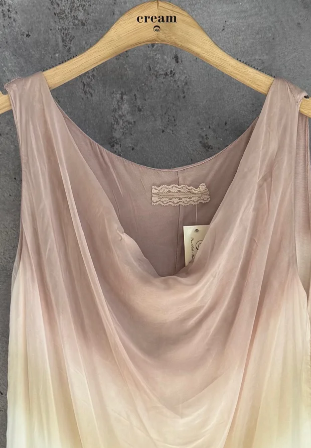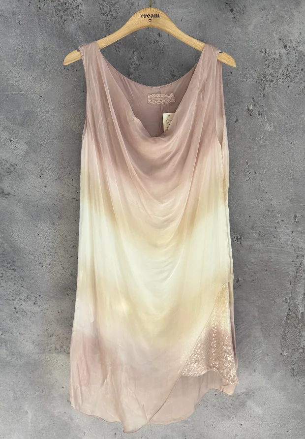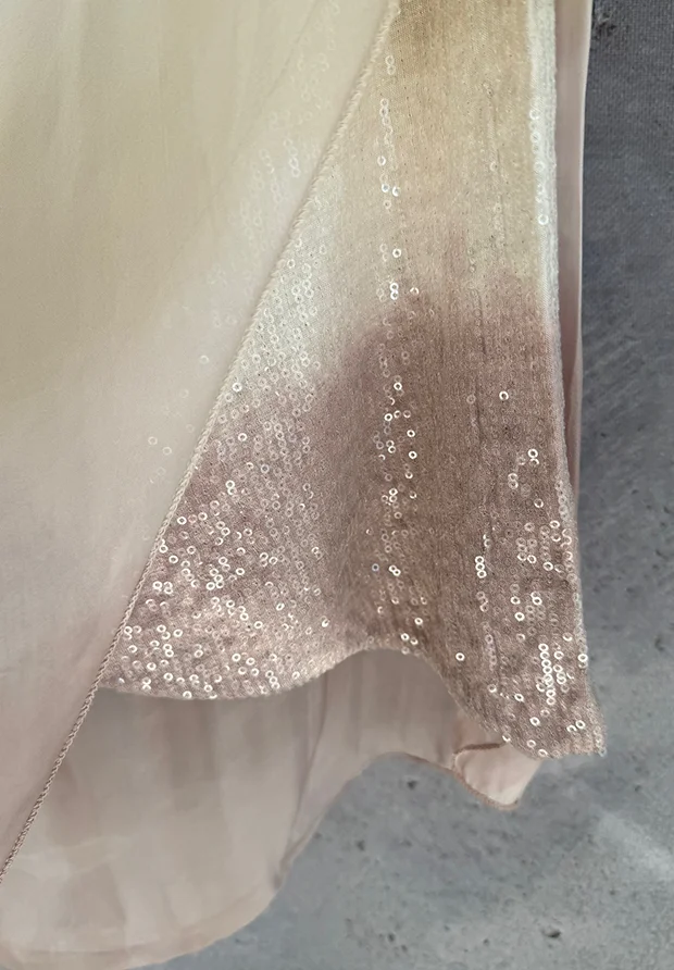 WŁOSKA JEDWABNA SUKIENKA OMBRE – PUDROWY RÓŻ I BEŻ – MADE IN ITALY – CEKINY