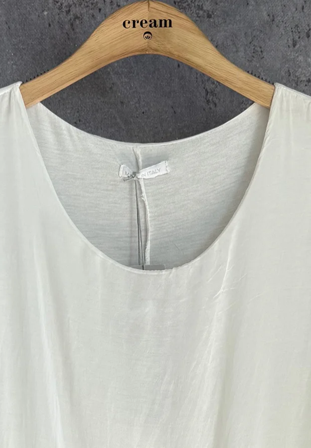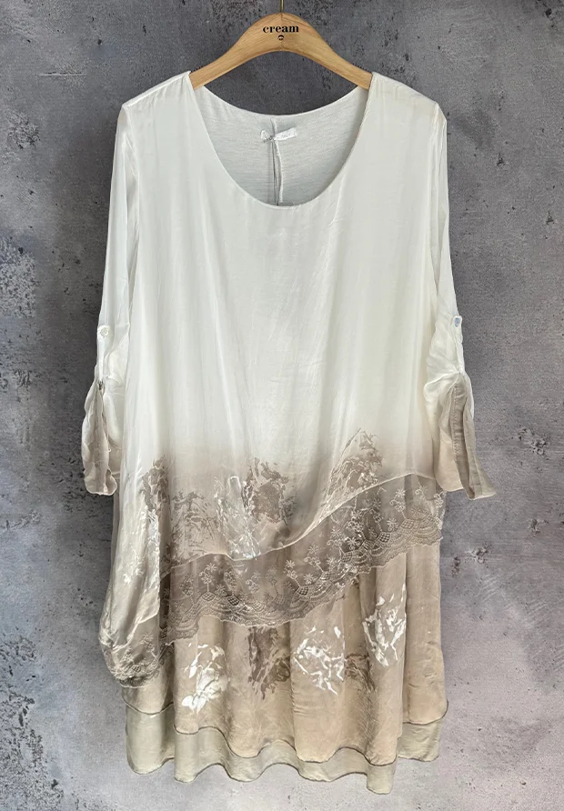WŁOSKA JEDWABNA SUKIENKA WARSTWOWA 3D – BIEL I PIASKOWY BEŻ – DÓŁ Z KORONKĄ – MADE IN ITALY