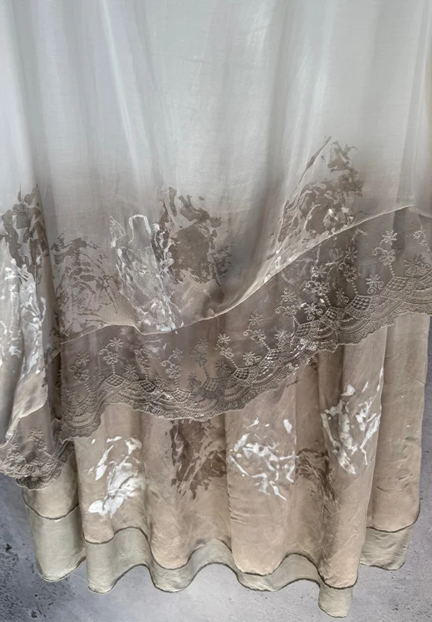- Wielowarstwowe wykończenie z koronką: sukienka składa się z lekkich warstw jedwabiu, a jej dół został zwieńczony szeroką, misternie wykonaną koronką w kolorze beżowym. To zestawienie nadaje kreacji szlachetnej objętości i wyjątkowo eleganckiego, wizytowego charakteru.
