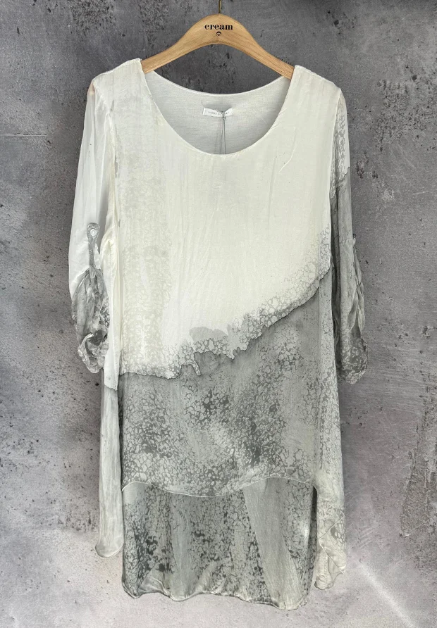 WŁOSKA JEDWABNA SUKIENKA WARSTWOWA 3D – MARMURKOWA SZAROŚĆ I BIEL – REGULOWANY RĘKAW – MADE IN ITALY