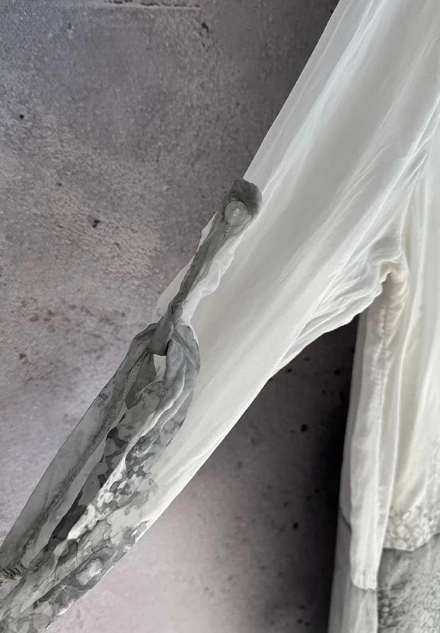 - Asymetryczna, warstwowa konstrukcja: sukienka składa się z nachodzących na siebie warstw jedwabiu o nieregularnych brzegach. Biała, wierzchnia warstwa została subtelnie wykończona delikatną koronką, co nadaje kreacji szlachetnego i bardzo kobiecego charakteru.