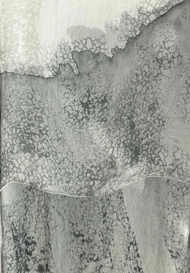 - Unikalny efekt 3D: nowoczesny, marmurkowy motyw został naniesiony zarówno na zewnętrzną warstwę naturalnego jedwabiu, jak i na elastyczną podszewkę. Dzięki temu warstwy wzajemnie się przenikają, nadając całości niesamowitej głębi i sprawiając, że wzór ożywa przy każdym Twoim ruchu.